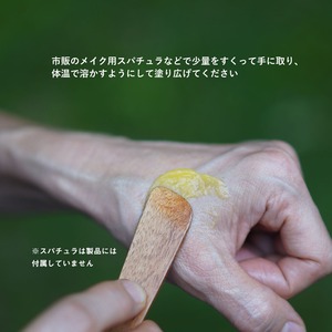 市販のメイク用スパチュラなどで少量をすくって手に取り、体温で溶かすようにして塗り広げてください。