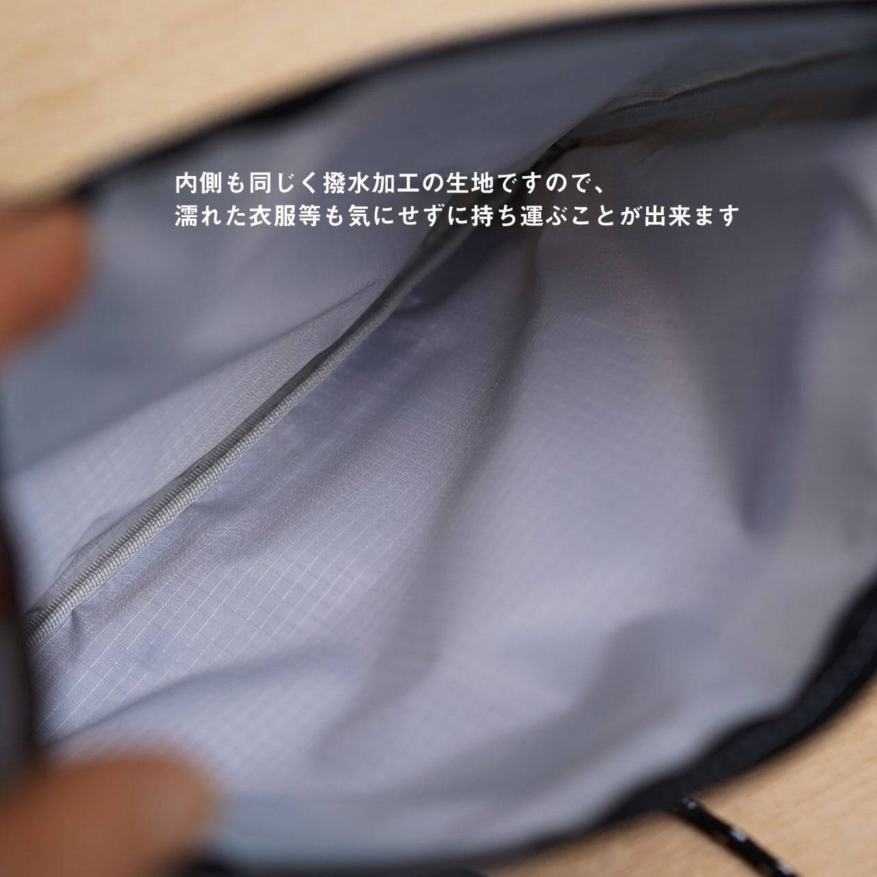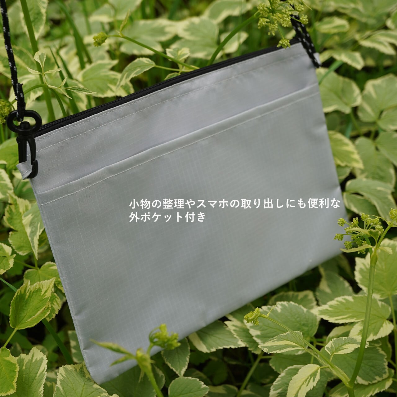 テントにも使用されるほどタフな撥水(はっすい)加工の生地を使用した、マチなしフラットな2WAYサコッシュ。開口部はファスナー付きで中身が飛び出す心配もありません。小物の整理やスマホの取り出しにも便利な外ポケット付きです。長さ調整可能な紐を取り外せば、ポーチにもなる優れもの。必需品を入れてちょっとしたお出かけにはもちろん、しなやかで軽量なのでアウトドアやレジャーシーンにも活躍します。