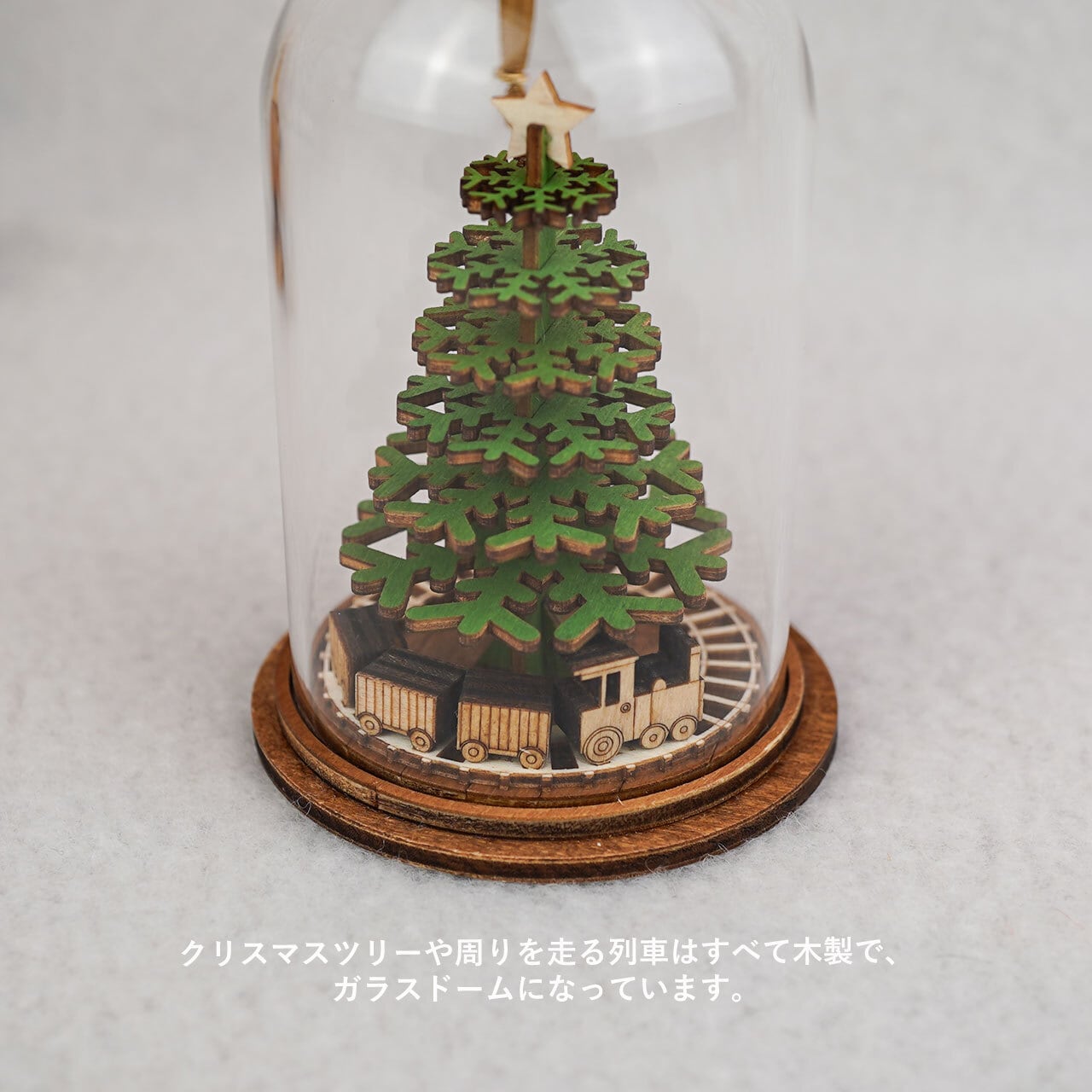 中のツリーと周りを走る列車、そして台座は全て木製で出来ています。それをまるごとガラスドームで包んだデザインは、どの角度から見ても楽しめる良さがあります。