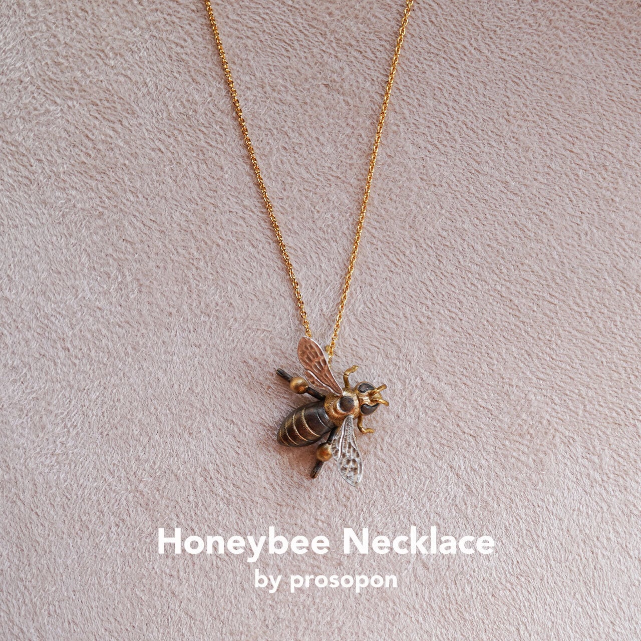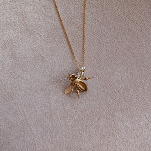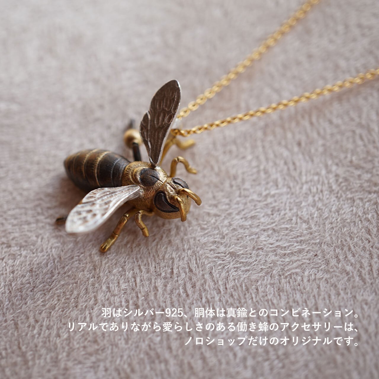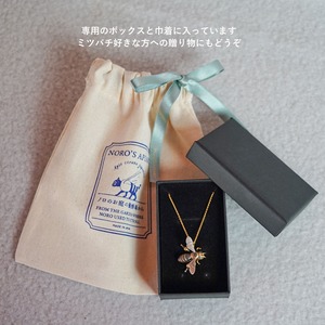 チャームポイントであるビーポーレン(後ろ脚の花粉玉)を付けた、かわいい働き蜂のジュエリーシリーズです。おうちの人(謙三)のミツバチ愛が高じて、なんとオリジナルで作ってもらいました。